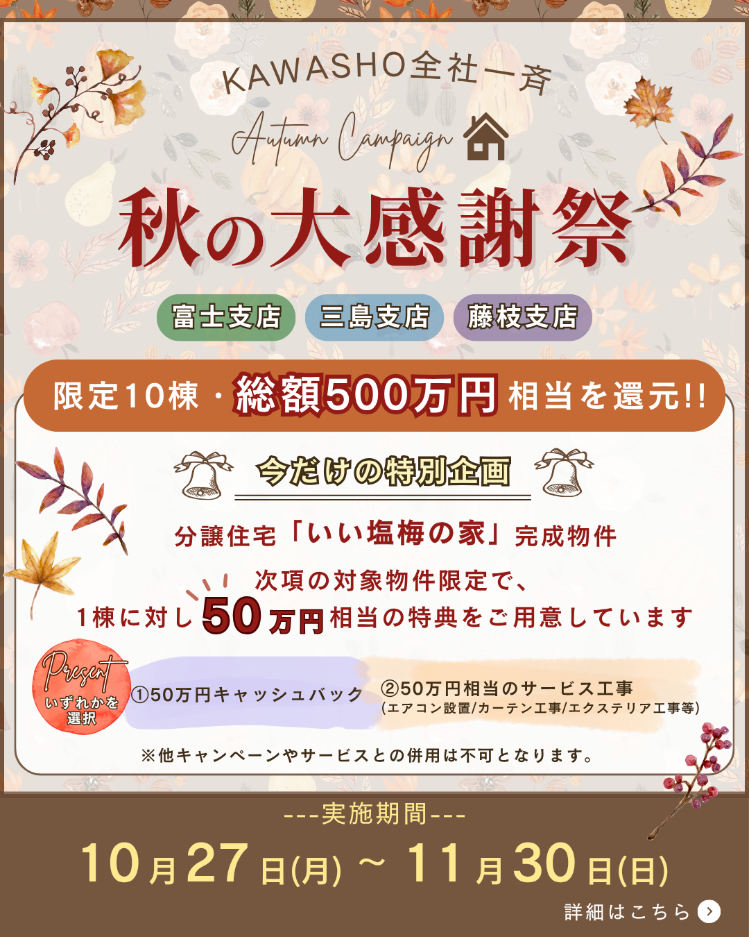 キャンペーン期間中に対象の物件をご成約で、1物件に対し「50万円のキャッシュバック」または「50万円相当のサービス工事(エアコン・カーテン・エクステリア等)」の特典をご用意しております!
