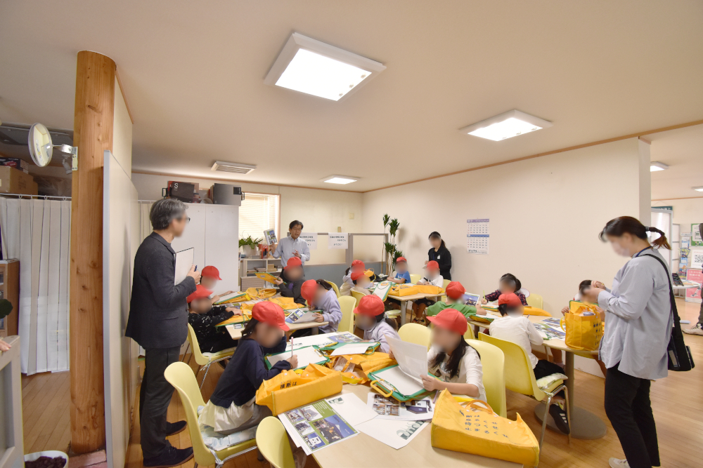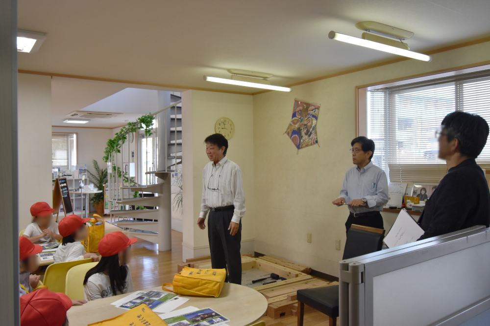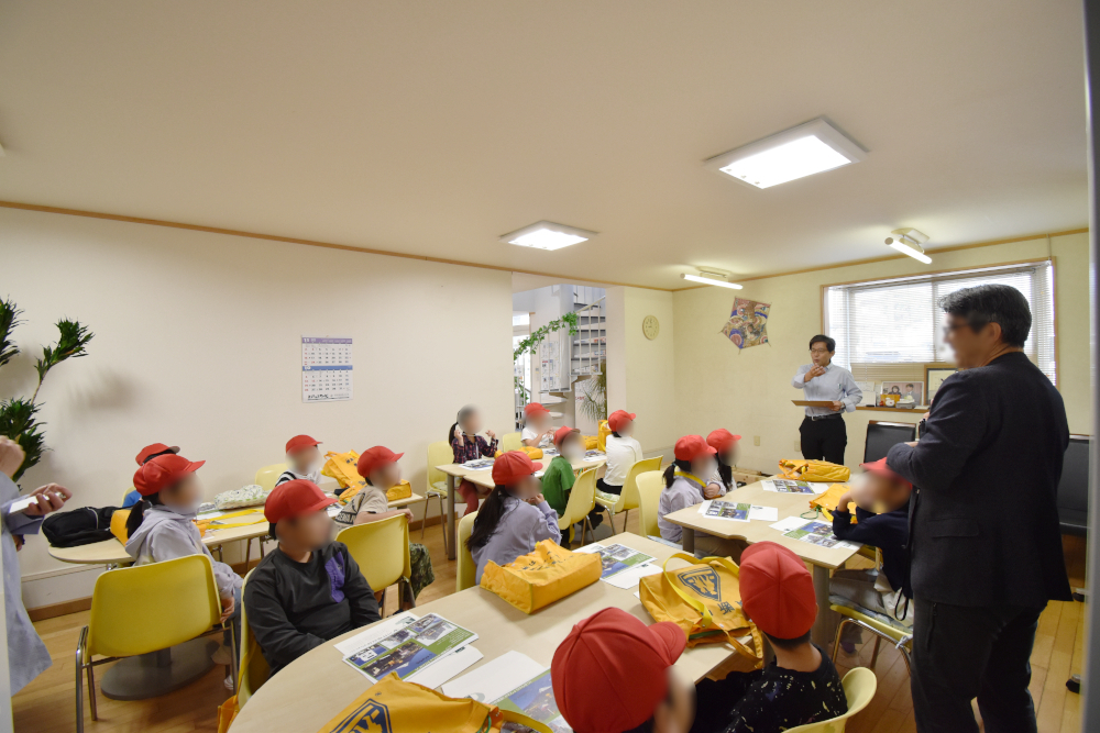 「伝法地区にはどんなすてきな場所があるのか」「そこで働く方々がどんな工夫をされているのか」「どんな思いで働いているのか」を知り、子どもたちが自分の住む地区をより好きになることを目的とした学習とのことで、川祥建設には15名の子どもたちが来ました。
