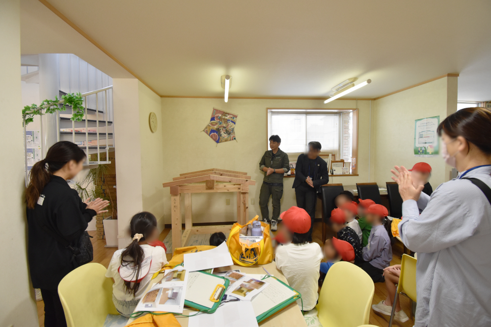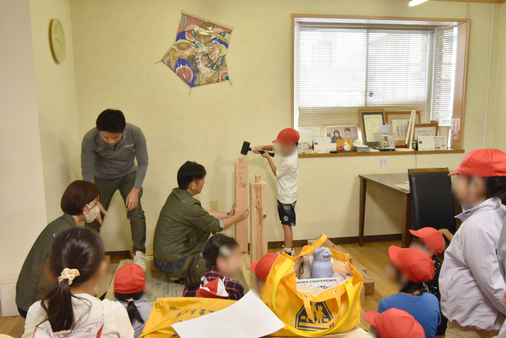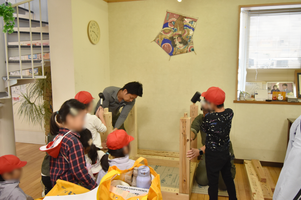 家ができるまでの説明を聞いてもらった後は、建築現場に行くのは難しいので、事務所内でミニ上棟体験をしてもらいました。