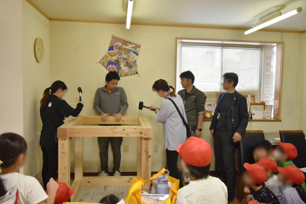 実際に一人一人に木を叩いてもらい、みんなで協力して組み上げました。