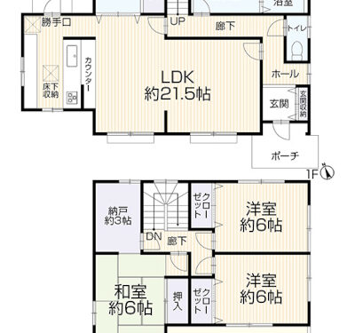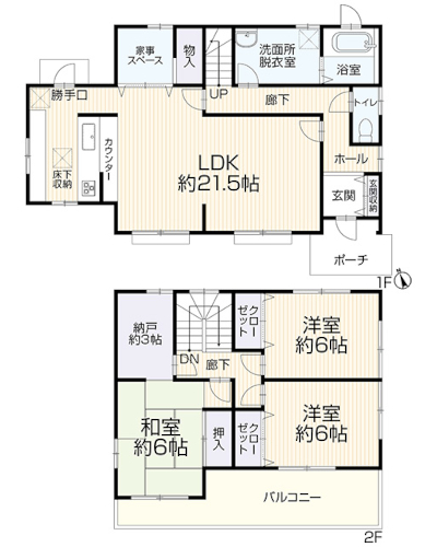 設備 | 公営水道・公共下水・オール電化 システムキッチン 洗髪洗面化粧台 洗浄便座 トイレ2ヶ所 追焚き給湯 LDK20帖以上 床下収納 各室収納スペース 納戸 バス1坪以上 南道路 瑕疵保証付(不動産会社独自) |