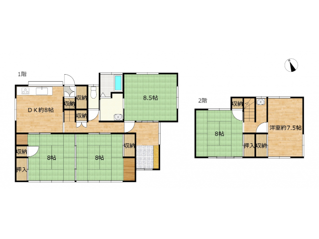 | 設備 | 個別LPガス・公営水道・個別浄化槽 瑕疵保証付(不動産会社独自) 全居室6帖以上 和室 ハイルーフ駐車場 浴室に窓 シューズクローク 南側庭あり 庭 庭10坪以上 勝手口 |