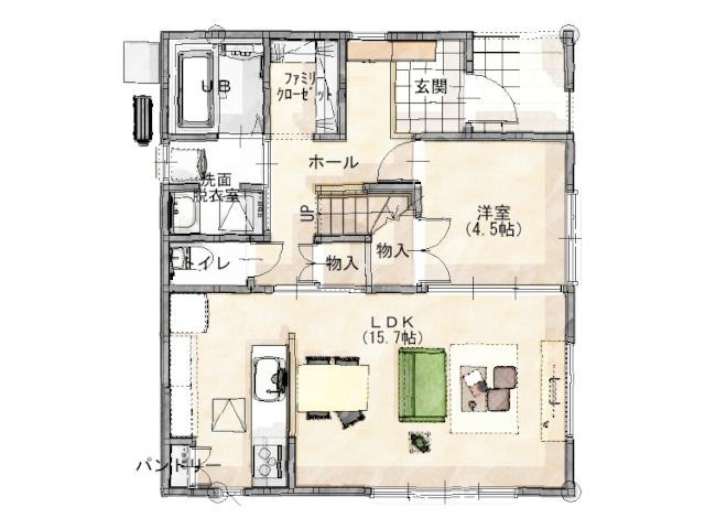 洗面脱衣室近くの1階ホールにファミリークローゼット♪