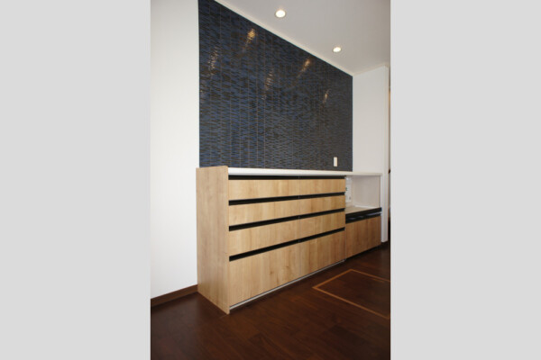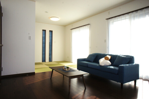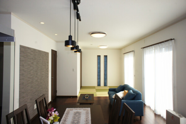 18.5帖のLDKは、広々と明るい印象。テレビボードの背面にはエコカラットを施工し、空間のアクセントに。