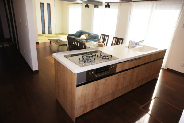 開放感のあるアイランドキッチンは、横に壁がない分空間をいっぱいに使え、お子様やお友達とも料理が楽しめます。ココットプレートを使うことで、グリル料理の幅も広がる嬉しいキッチンです◎