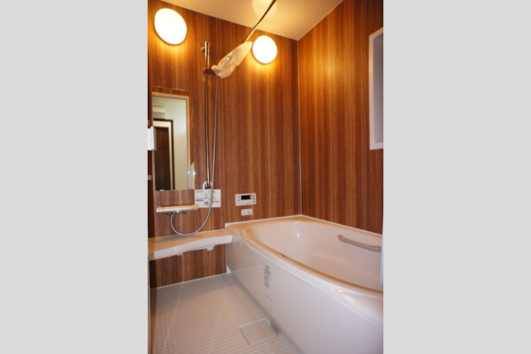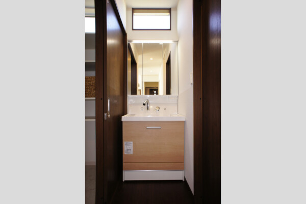 脱衣室には棚を設けたことで、タオルや洗濯かごもすっきり収納。