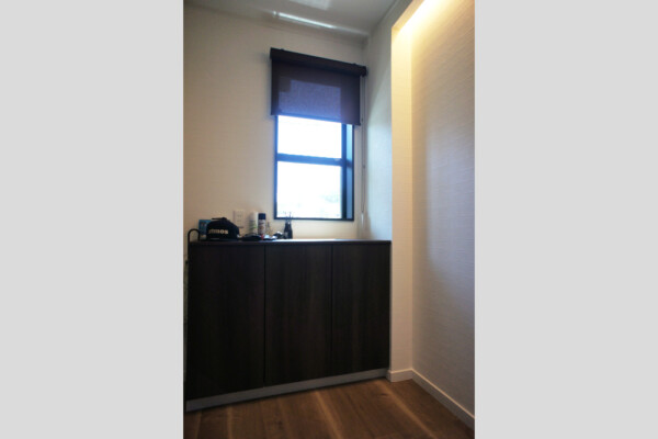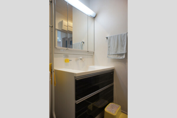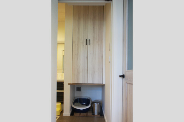 洗面脱衣所の入り口の扉には、キャットドアを設けています。扉を開けっ放しにすることなく、猫ちゃんが自由に移動出来ます。