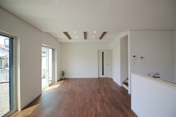 リビングは上がり天井に三本の梁と照明が並び、空間のアクセントとなっています。